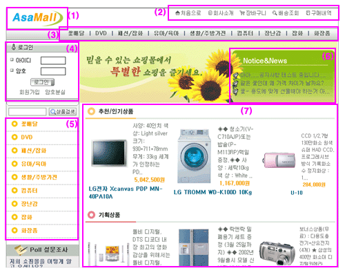 - (6) 공지사항 : 쇼핑몰의 공지사항이 나오는 위치입니다. 공지사항 부분을 편집하고자 할 경우에는 AsaMall 폴더에 있는 index.htm 파일을 열어서 수정하시면 됩니다. 기본으로 아사보드의 자동게시판 기능이 삽입되어 있으며 게시판 이름은 notice로 올려져 있습니다. 게시판 이름을 변경하고자 하실 경우에는 /AsaMall/index.htm 파일을 열어서 편집하시면 됩니다. 아사보드의 자동게시판 기능은 아사보드 자동게시판 사용법을 참조하시기 바랍니다.