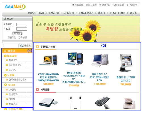 - (5) 왼쪽 메뉴 : 왼쪽 메뉴이며 이 메뉴는 쇼핑몰의 분류명이 나타납니다. 메뉴는 분류가 추가되면 자동으로 나오나 분류 밑에 배너를 삽입하거나 다른 문구를 넣고자 할 경우 AsaMall 폴더에 있는 left.htm 파일을 열어서 수정하시면 됩니다.