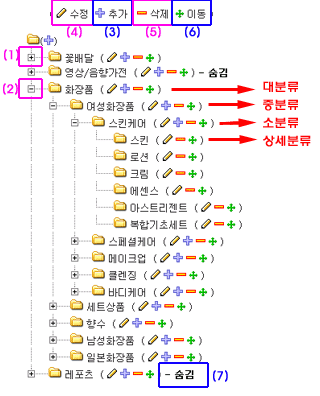 - (1) "+"로 표시되어 있는 부분을 클릭하면 하위 분류를 보여줍니다.