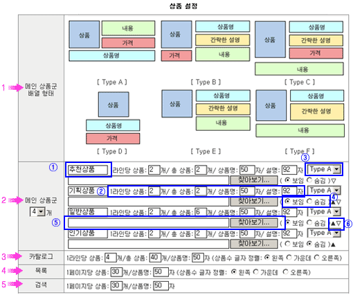 • (2) 메인 상품군 :해당 분류의 메인 페이지에 표시할 상품군들의 명칭 및 상품 개수를 설정합니다.