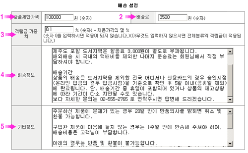 • (2) 배송료 : 상품제한 가격보다 상품의 가격이 낮은 제품일 경우 이 곳에서 설정한 배송료가 붙습니다.