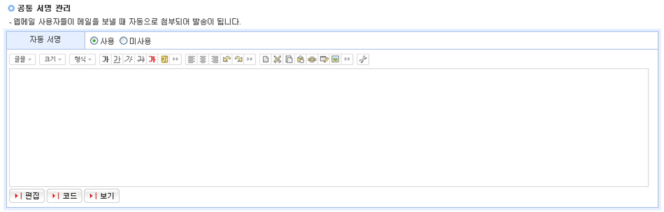 - 모든 웹메일 사용자들이 메일을 보낼때 자동으로 서명을 첨부하도록 추가하는 기능입니다. 사용자마다 개인 서명을 추가할 수 있으며, 사용자 개별 서명하단에 추가됩니다.