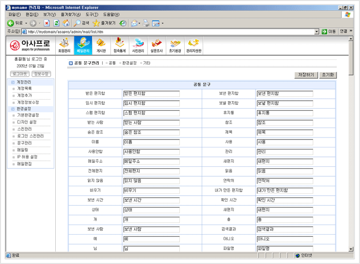 문구관리란 사용자페이지에서 볼 수 있는 모든 텍스트 문구들을 모아 놓은 것입니다. 기본적으로 제공된 문구를 변경하려고 할 때 사용하며 공통, 환경설정, 기타로 구분되어 있습니다. 기본값을 복원할 경우