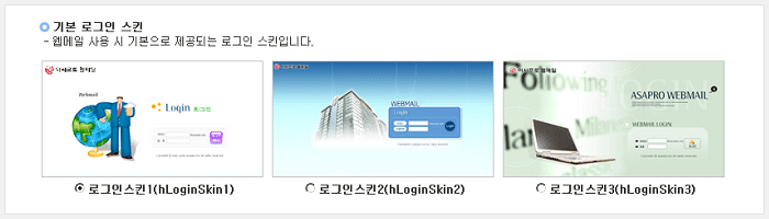 • 다양한 스킨을 제공하고 있어 스킨변경 버튼 클릭 한 번으로 웹메일 화면 및 로그인 화면을 실시간으로 변경할 수 있습니다.