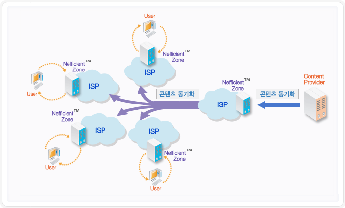 자체 개발한 콘텐츠 동기화 솔루션을 사용하여 CP의 콘텐츠 추가/변경 작업 시 이를 실시간으로 Nefficient™ Zone 서버로 분산시켜 콘텐츠를 동기화함으로써 인터넷 이용자에게 항상 최신의 콘텐츠를 전송할 수 있습니다.