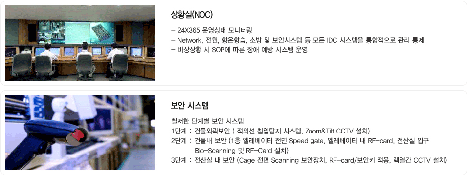 가산 LG IDC의 보안 센터는 상황실 통제 아래 3단계 보안이라는 첨단 보안 센터를 운영 중에 있으며 RFID 시스템을 통한 철저한 모니터링 및 신속한 대응을 목표로 하고 있습니다.