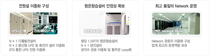 IDC 네트워크 장비와 라우팅 경로는 모두 이중화로 구성되어 중단없이 안정적인 시비스를 제공하고 있으며 센터 간 연동망 구성으로 고객시스템의 안정성을 최대한 확보하고 있습니다.