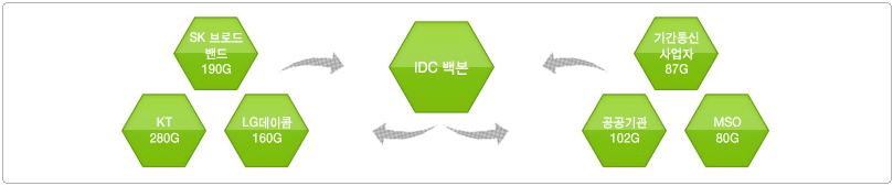 국내망은 국내 모든 IPS 사업자와 연동되어 있으며 KT, SK 브로드밴드와 대용량 연동망을 구성하고 있습니다.